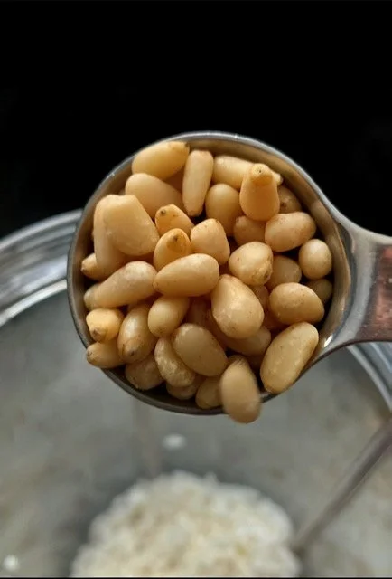 Soak ⅓ cup of short-grain rice in cold water for 1-2 hours. Drain and rinse the rice andput it into a blender. Add 2 tbs pine nuts and 2 cups of water to the blender.